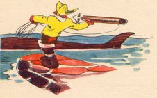 | Und ein Fischer lief zur Buhne, Schwang geschickt dort die Harpune, Fing das Tier und zog's ans Land. Aber denkt euch, was man fand In dem Bauch des Wals, ei, ei? Reste waren's von den zwei Bösen Mädchen Len' und Liese, Die man legte auf die Wiese! |
