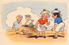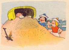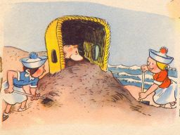 | Am Strande sitzen im Verein Des Nachmittages groß und klein. Die Großen lesen, zeichnen, schwatzen, Die Kinder lärmen wie die Spatzen Und führen ungemein gewandt Viel Bauten auf aus weißem Sand. |