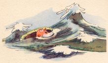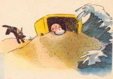 | Doch siehe da, es ist zu spat, Die Flut in großen Wogen naht, Und - schwapp! - der Strandkorb segelt hin, Sein armer Herr sitzt zappelnd drin. |