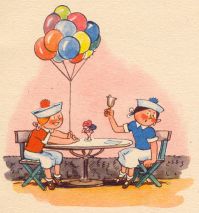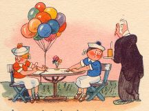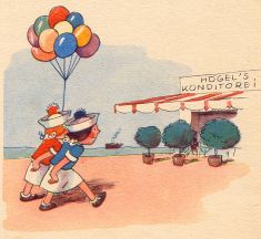 | Mit den Luftballons versehn Sieht man übermütig gehn Zur Konditorei von Högel Unsre beiden lockern Vögel. |