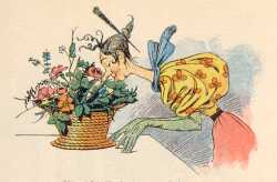 Als die Base dann allein, Saugt verzückt den Duft sie ain, Steckt darauf, ganz in Ekstase, In den Blumenkorb die Nase. |