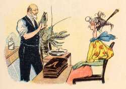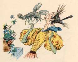 Plötzlich schreit sie fürchterlich: »Hilfe, Hilfe! Rettet mich!« An der Nase, ihr zum Kummer, Hing ein riesengroßer Hummer, Der, je lauter sie nun schrie, Sich nur noch fester biß in sie. |
