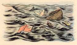 | Der Schläfer rührt sich bald darauf Und reißt entsetzt die Augen auf. Das Wasser rauscht, die Flut erschwillt, Er sitzt im Korb als Jammerbild. Die Wellen kommen ungestüm, Die Haare stehn zu Berge ihm. |