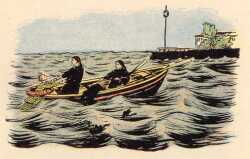 | Zum Glück sah man vom Strand die Not Und schickt sofort ein Rettungsboot; Das nahm den armen Menschen auf, Sonst war vorbei sein Lebenslauf. So schließt der vierte Ferientag, |