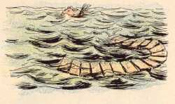| Die den Schwimmring halten fest, Wenn man sich auf ihn verläßt. Als dann eine Welle kam, Sie den Schwimmring mit sich nahm, Und vor Schreck, mit offnem Mund, Sank die Frau bis auf den Grund. |