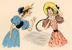| Und just abgesehn auf diese Hatten es die Len' und Liese. Wie die Frau im Gummihut Fröhlich plätschert in der Flut, Kommen Len' und Lies' von hinten, Ihr die Bänder aufzubinden, |