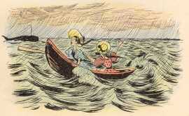 | Weiter, weiter fährt das Boot. Ach! Nun sind sie arg in Not, Denn zur Flut stellt obendrein Noch ein heft'ger Sturm sich ein. Nur so groß noch wie ein Ei Sehn sie liegen Norderney. Bald darauf jedoch, o Graus! Ist auch diese Freude aus. Ach, das war ein Herzeleid, Denn zum Schwimmen war's zu weit, Und das Schrei'n, ihr lieben Kinder, Half den Mädeln noch viel minder, Denn es hört das Schreien beider Nur ein großer Walfisch leider. |